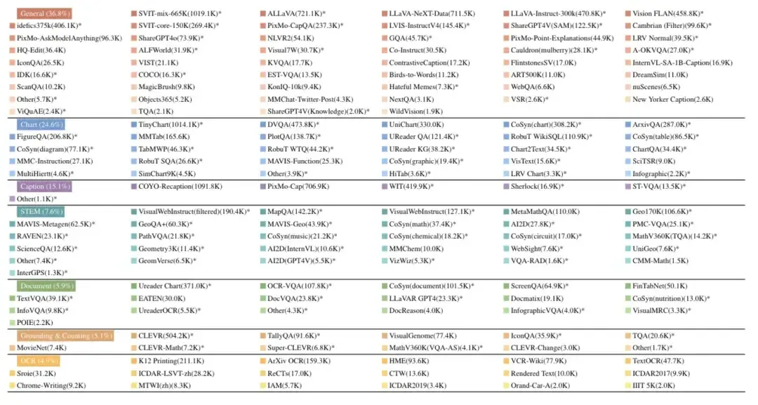 如上图所示,数据集的来源多样化,策略性地覆盖了7大领域,确保了模型的全面发展:
