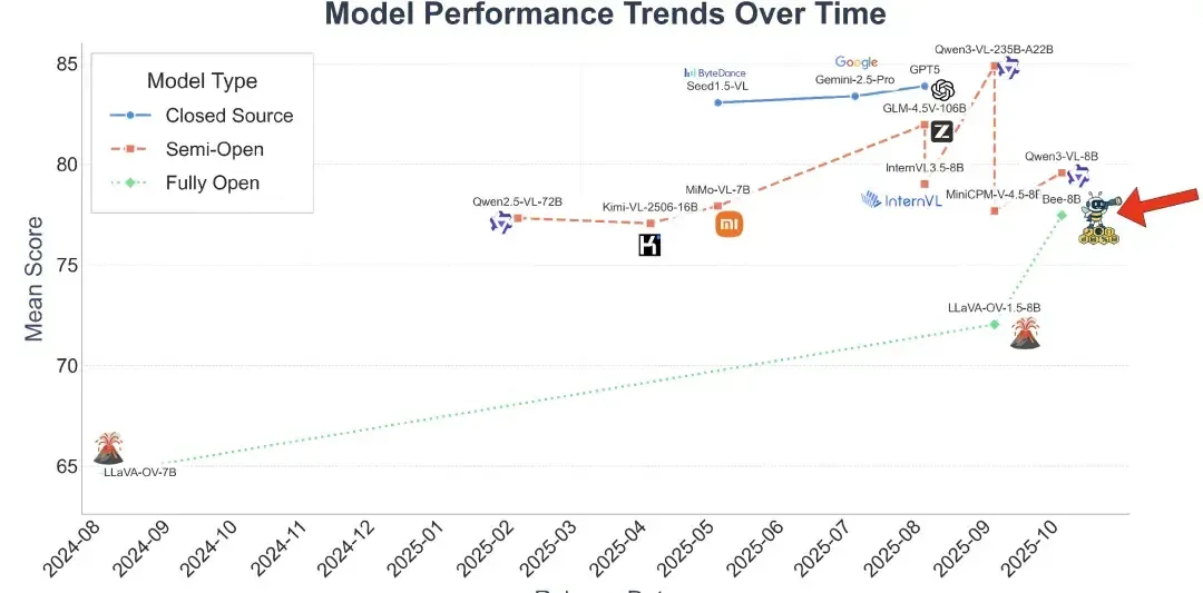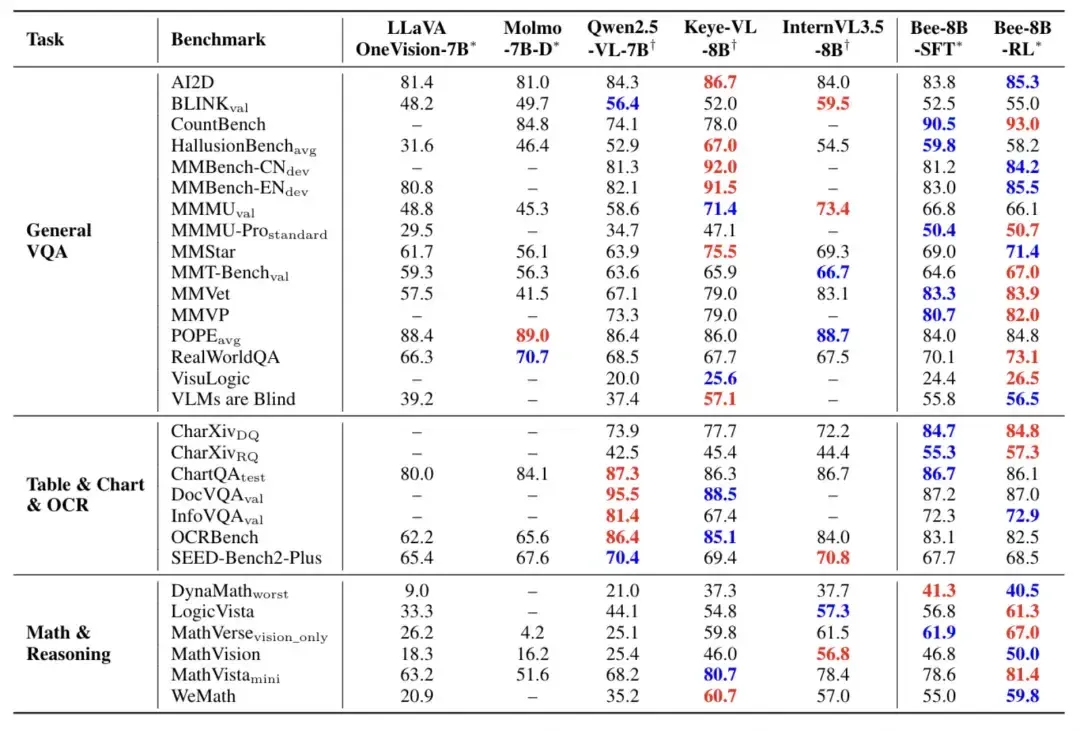 Bee-8B的表现在全开源模型中全面领先,并在多个关键基准上匹敌或超越了Qwen2.5-VL-7B和InternVL3.5-8B等强大的半开源模型。