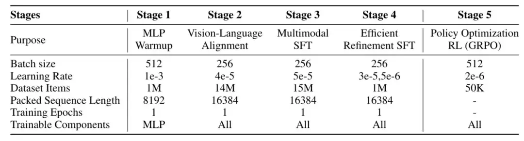 5. 策略优化RL (Stage 5):使用GRPO算法 ,在50K数据上进行RL训练 ,以解决SFT阶段常见的文本重复等问题,提升输出可靠性。