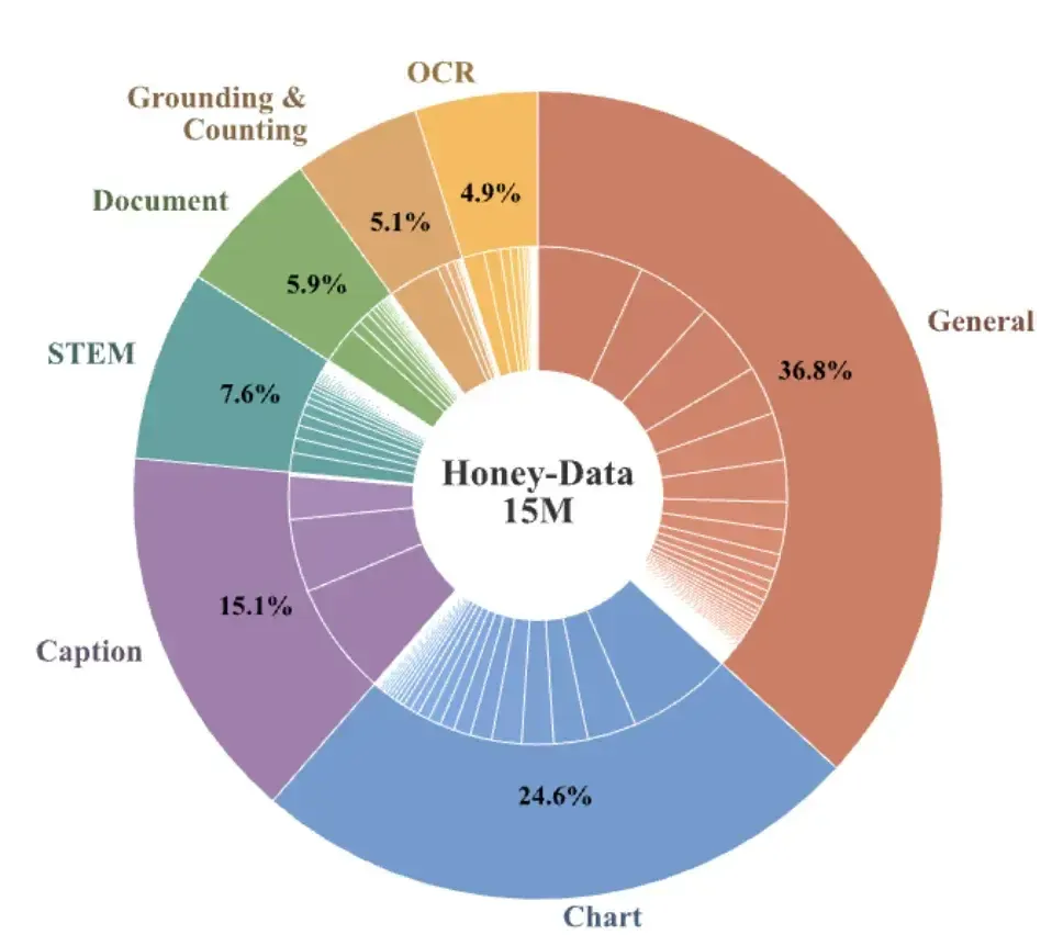 HoneyPipe流程的最终产物是Honey-Data-15M,一个包含1500万精心策划样本的大型多模态SFT数据集。