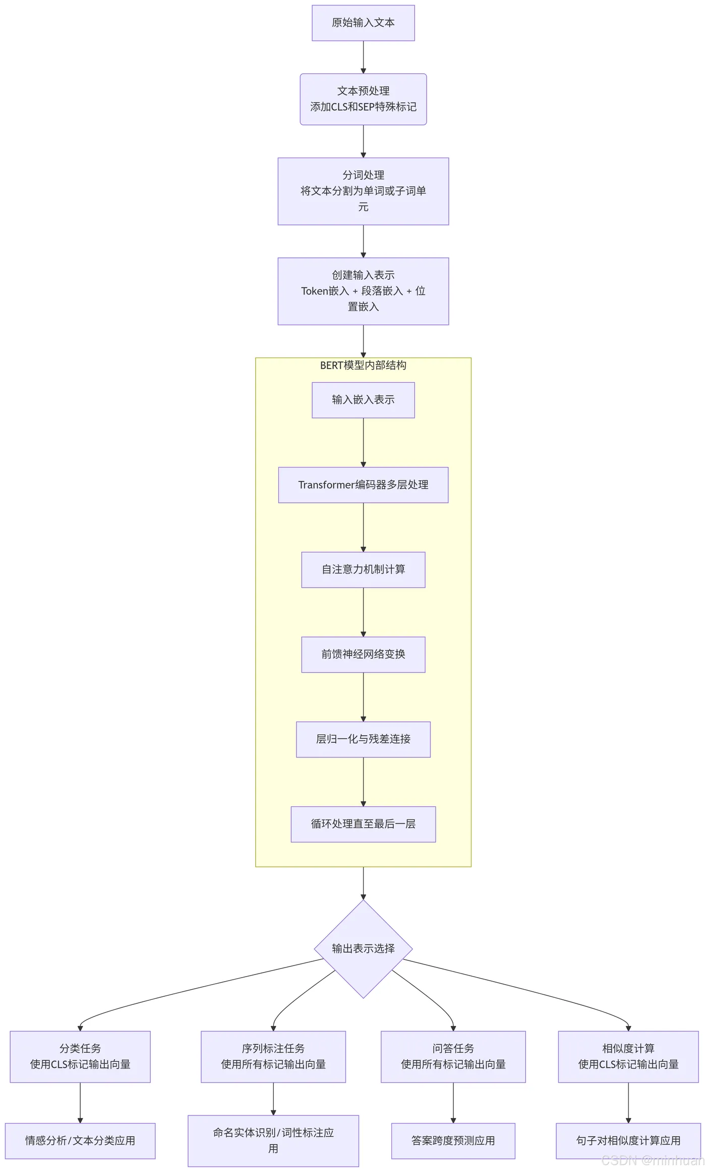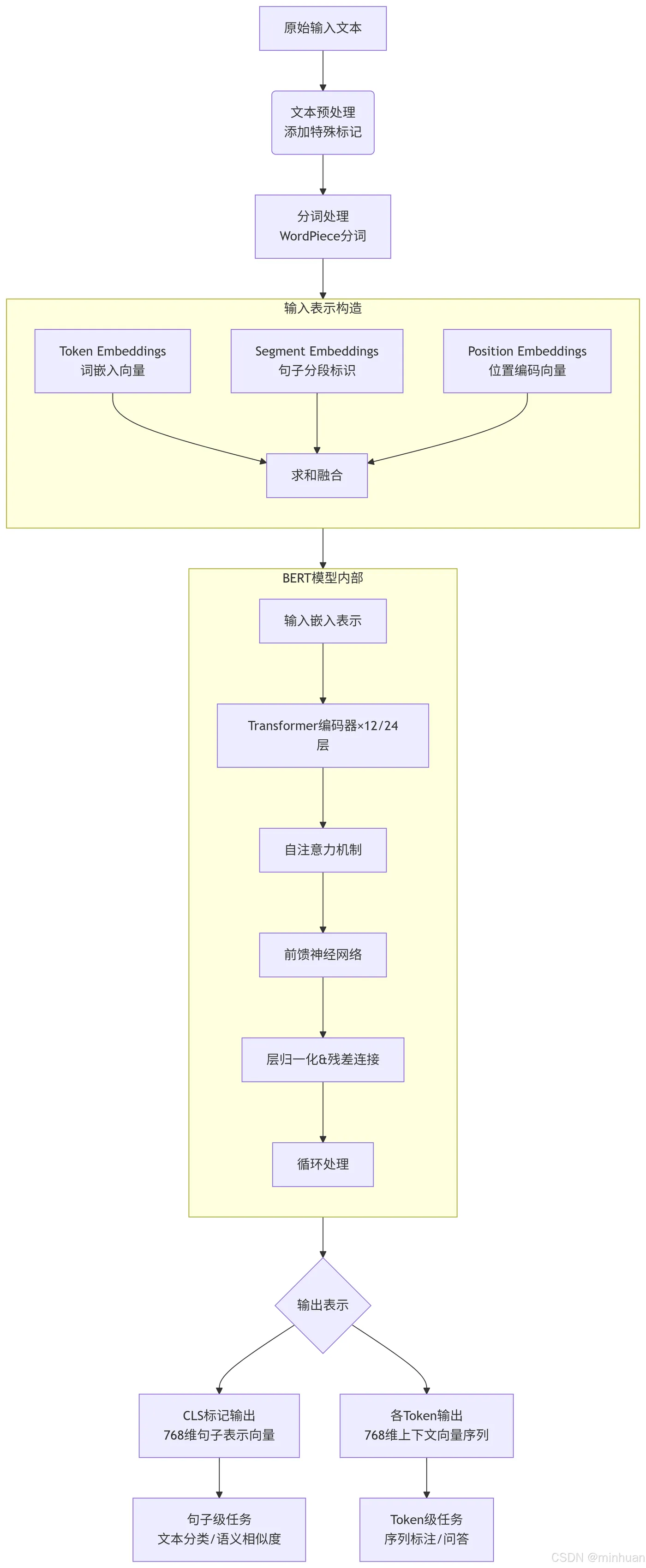 输入文本: [CLS] 我 喜欢 自然 语言 处理 [SEP] 输入表示(简化): [CLS] 我 喜欢 自然 语言 处理 [SEP] (每个token转换为向量,加上段嵌入和位置嵌入) BERT模型: ┌───────────────────────────────────────────────────────────────┐ │ Transformer编码器 (多层) │ │ ┌─────────────┐ ┌─────────────┐ ┌─────────────┐ │ │ │ 自注意力机制 │ │ 前馈神经网络 │ ... │ 层归一化 │ │ │ └─────────────┘ └─────────────┘ └─────────────┘ │ └───────────────────────────────────────────────────────────────┘ 输出: 每个输入token对应的上下文向量(相同维度): [CLS]向量 我的向量 喜欢的向量 自然的向量 语言的向量 处理的向量 [SEP]向量 Token Embeddings: E[CLS], E_我, E_喜欢, E_自然, E_语言, E_处理, E[SEP] Segment Embeddings: 0, 0, 0, 0, 0, 0, 0 Position Embeddings: P0, P1, P2, P3, P4, P5, P6 最终输入向量 = E[CLS]+0+P0, E_我+0+P1, E_喜欢+0+P2, E_自然+0+P3, E_语言+0+P4, E_处理+0+P5, E[SEP]+0+P6