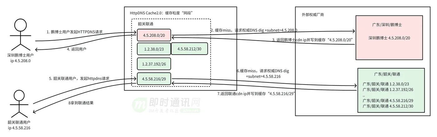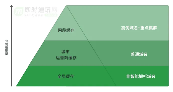在 HTTPDNS 场景中,不同域名对解析精度的需求不同。高优先级域名(如API 调用、直播 / 点播流媒体分发)对解析精准性要求高,跨网可能导致访问延迟增加;而低精度需求域名(如302域名)采用过细缓存会浪费存储资源,频繁回源也会增加权威 DNS 压力。