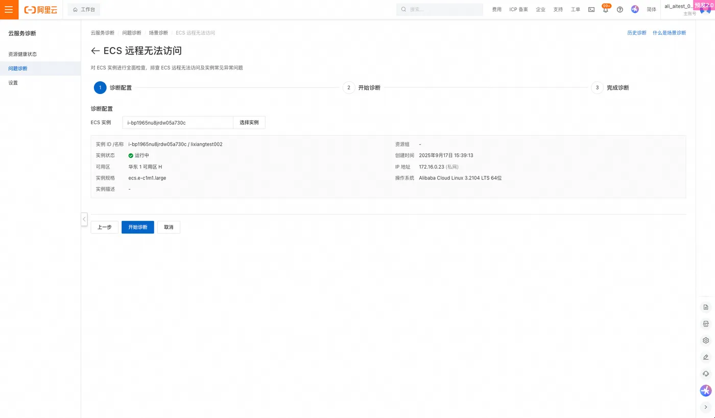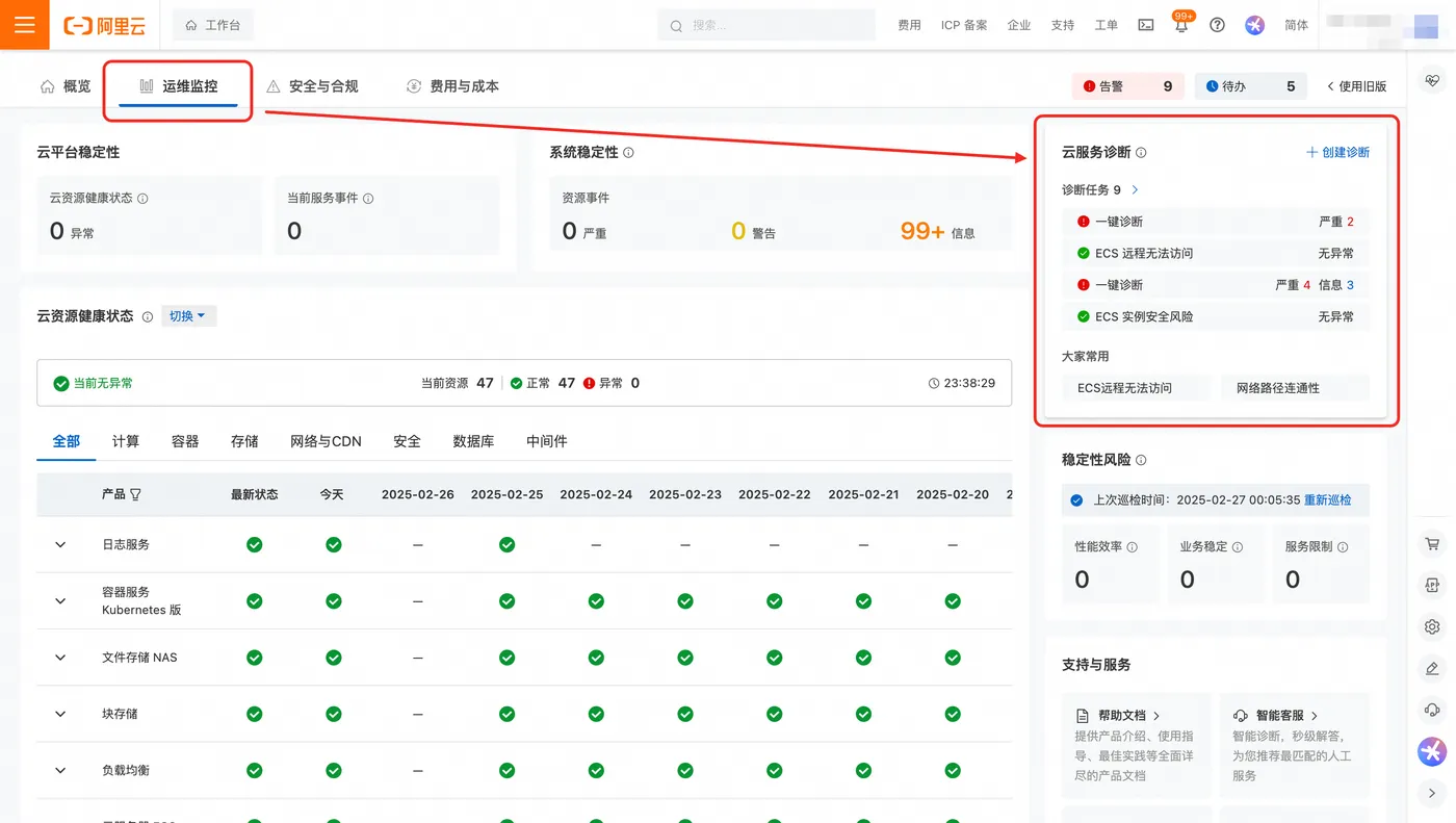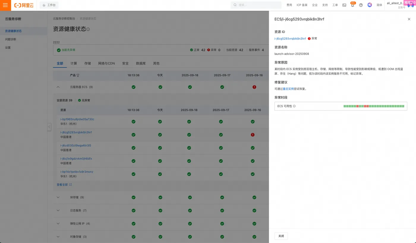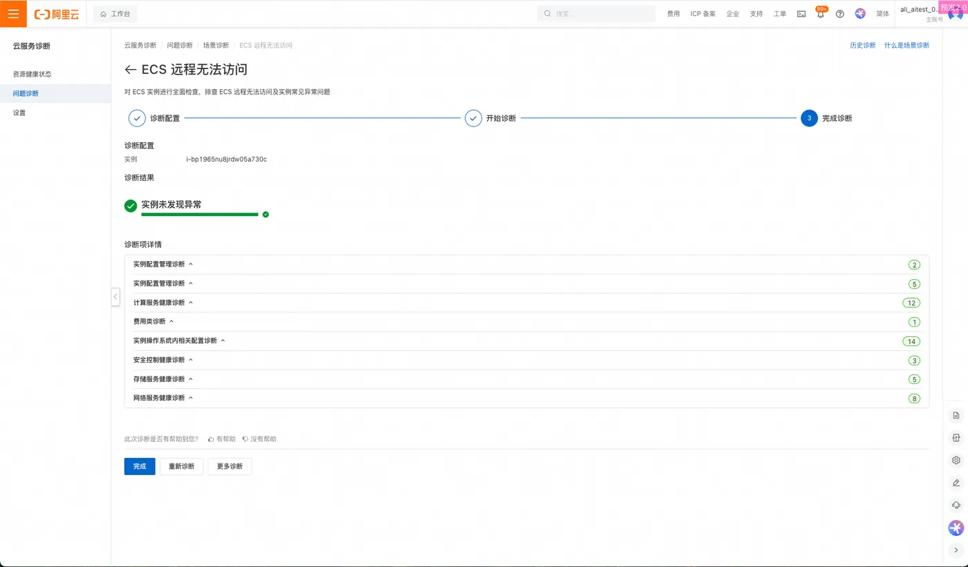 云资源健康状态正常,则可先排除阿里云云服务底座异常,转而及时排查其它问题原因。此时,您也可通过“一键诊断”快速排查网络、配置、性能、安全等常见问题。
