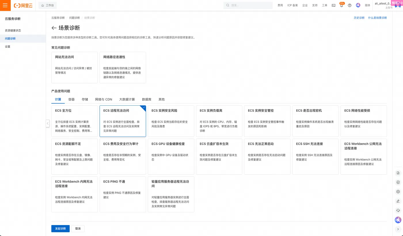 用户如果已经明确了具体是哪些云产品导致资源异常,可以在场景诊断中选择针对性的诊断工具,快速诊断并获取修复建议。了解已支持的全部诊断场景,请参见诊断支持场景及说明。