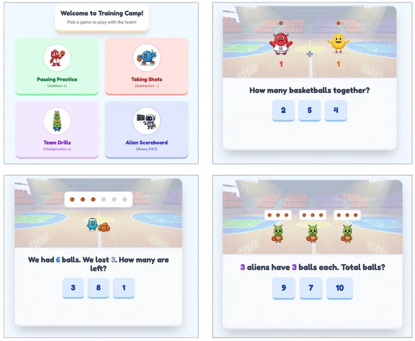 你问:“教我 5 岁孩子加减法” → 它做出一个篮球主题的数学小游戏,小怪兽投篮练加法,机器人计分练二进制。