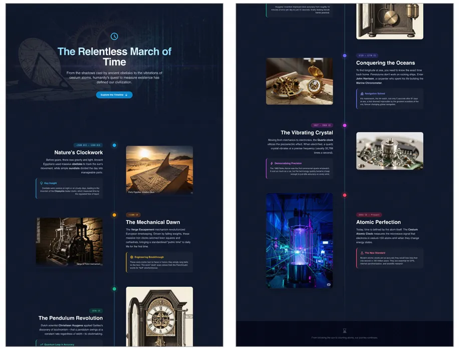 你问:“历史上有哪些计时工具?” → 它呈现一个垂直滚动的时间轴页面,从日晷到原子钟,每一段都配有生成的插图和关键突破说明。