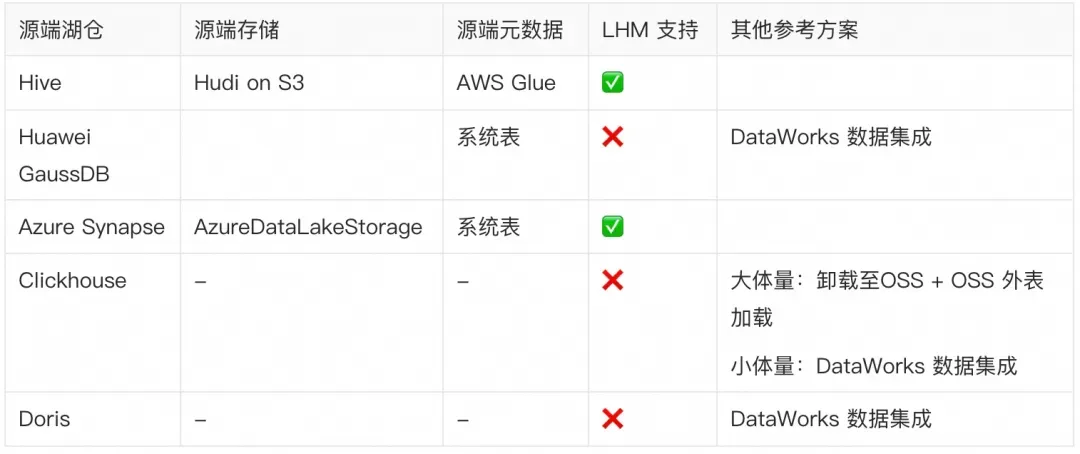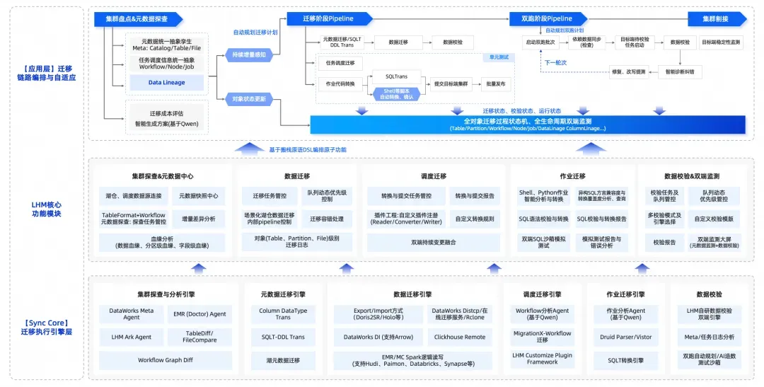 一站式湖仓迁移中心 LHM(LakeHouse Migration),是阿里云自研的数据平台一站式跨云、跨平台迁移工具。支持多引擎湖仓数据平台集群探查、元数据增量发现与同步、大规模数据湖文件迁移、表格数据同步、SQL转换、调度Workflow转换、数据校验、双跑沙箱测试等能力,实时监控同步作业、源端目标端平台差异,辅助客户在线可视化完成湖仓技术栈整体迁移。