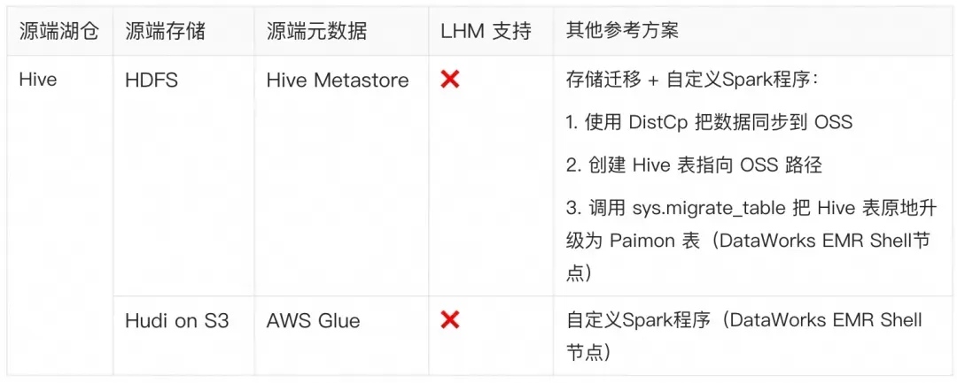 - 从传统表迁移至数据湖表格式:这是最常见的现代化改造场景,例如将一个传统的 Hive 表迁移为 Paimon 表。此过程必须采用逻辑迁移,即使用 Spark 等计算引擎读取源表的所有数据,然后按照新的表格式规范写入目标存储。