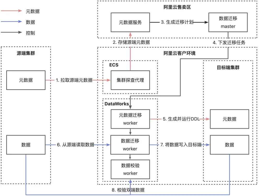- 阶段二:存储迁移:将源端HDFS上的物理数据文件高效地迁移至对象存储(OSS)作为临时中转。