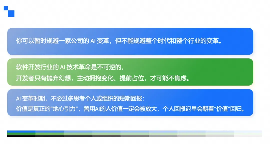 当然,站在 AI 浪潮最前的团队是很辛苦的,他们既要做业务,又要提效,还要适应 AI 时代的转型变革,但就是自然而然地不焦虑了。因为对于程序员来说,未来几年一定要接受 AI,要基于 AI 去做事,这是个本质的存在。
