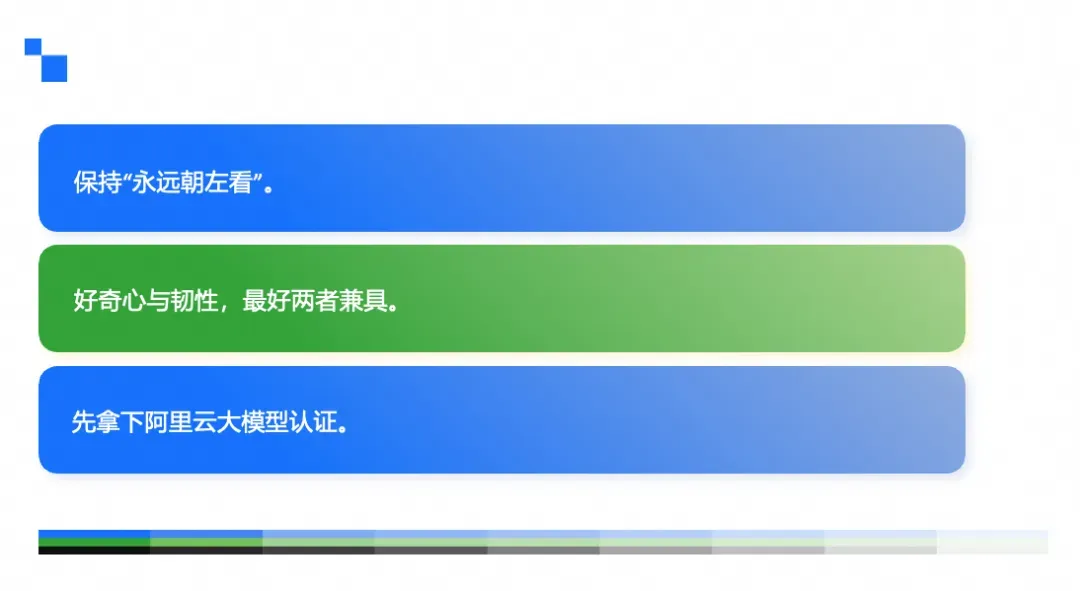 当然,即使不是人人都具备这些特质,企业的整个组织也会“拖着”大家往前走。比如,阿里云以 CIO 团队为原点,很早开始推动“书同文、车同轨”的 AI 通识教育,通过 阿里云大模型认证 培训的方式,让技术人、非技术人都掌握相同的 AI 知识,让部门、跨部门都处在一个 AI 语境下沟通。