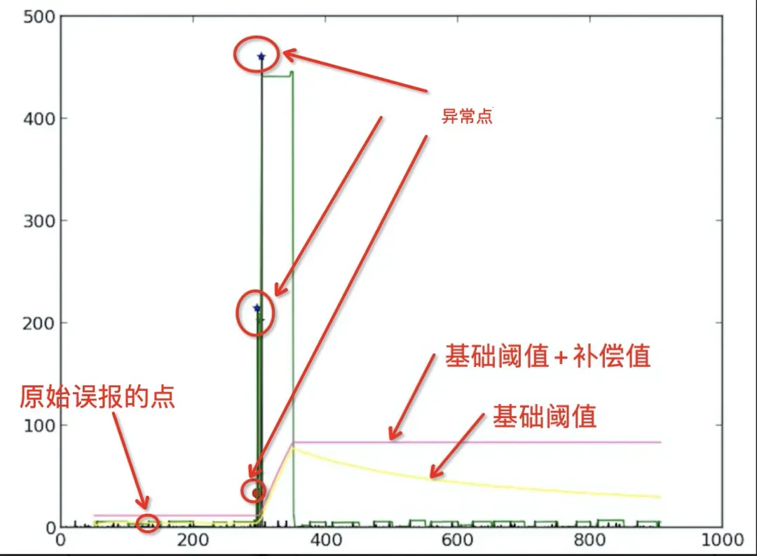 特别地,如果数据已超出“最小静态阈值”,则“动态调整阈值”的计算会简化,不再考虑“常态补偿值”,直接使用“基础阈值”作为判断依据,以聚焦更明显的异常情况。