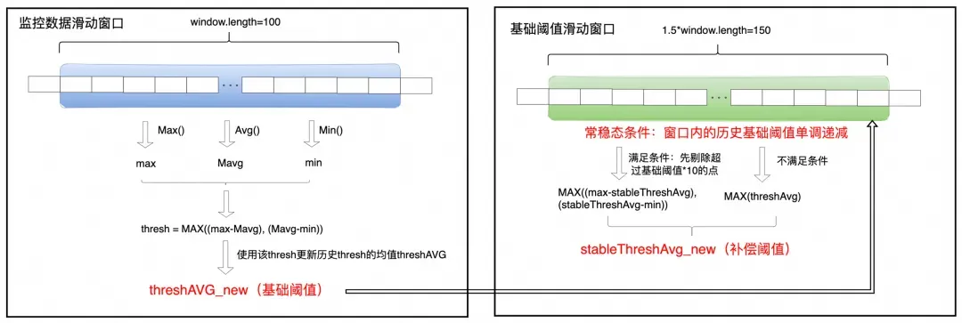我们通过动态窗口持续观察数据,计算窗口内数据的最大偏离平均值作为“瞬时波动值”。然后,将所有“瞬时波动值”的平均值作为“基础阈值”。这个阈值会持续自适应地更新,以反映数据最新的波动特征。