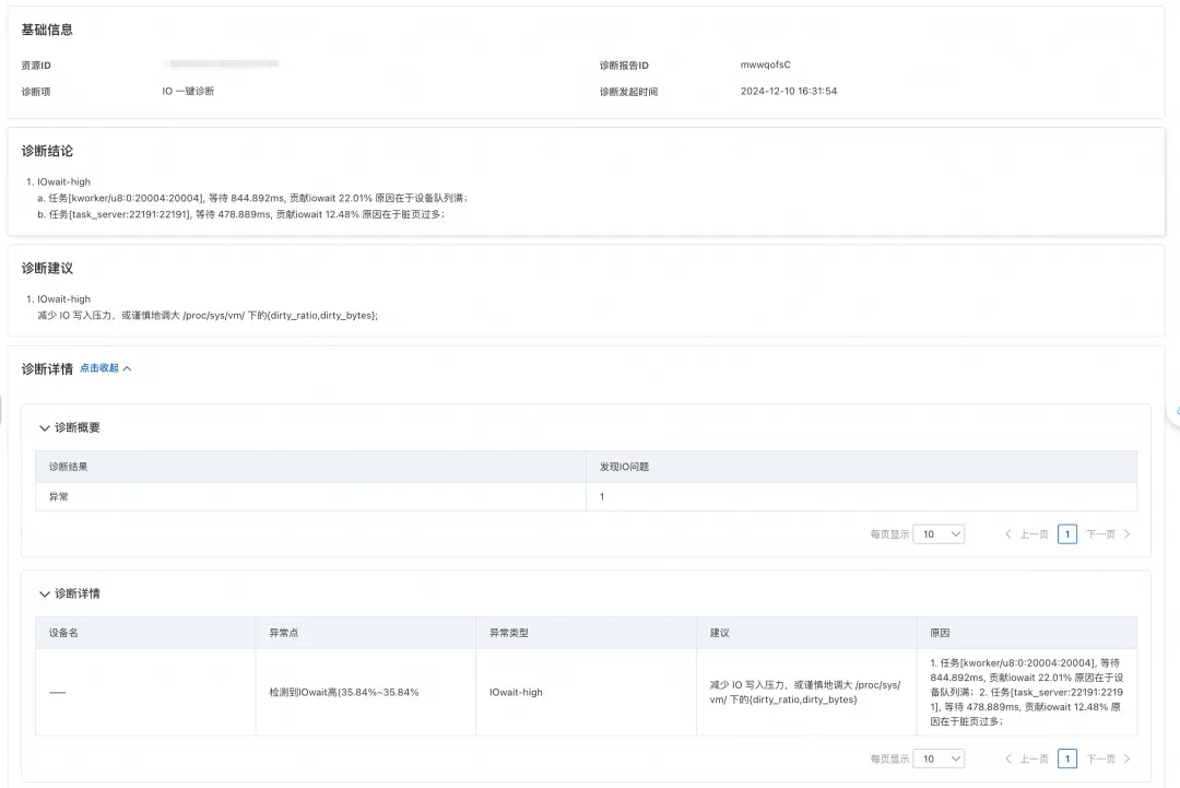 - 对于 IO 高延迟异常,经过分析后,在监控的日志栏中汇报异常期间 IO 的延迟分布,输出 IO 延迟最大的路径。