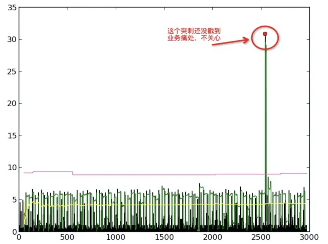 IO 指标其实是一种时间序列,而且一般地,在一个时间区间内,可以认为绝大部分时间是没有异常的,因此序列形成的曲线趋势是趋于平稳的,当出现异常的时候,会产生一个明显偏离平稳趋势的尖峰,因此第一步要做的就是通过本节计算得到的基础阈值把 IO 指标中的尖峰毛刺筛选出来。