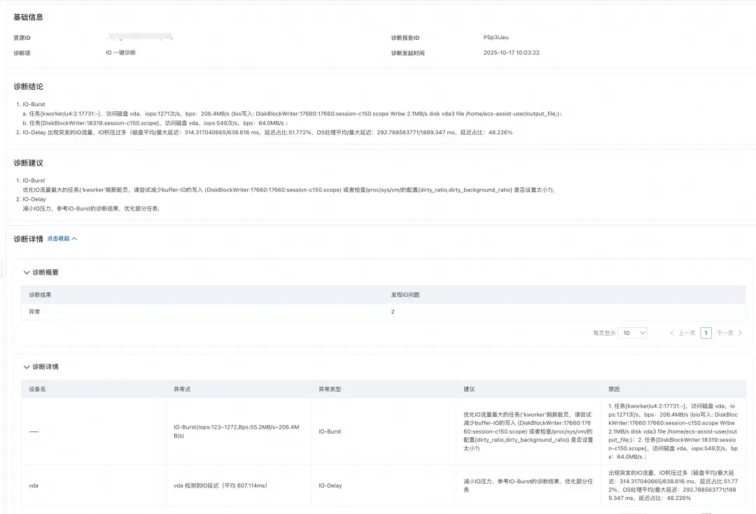 用户普遍缺乏对 IO 异常类型的识别能力(如区分 IO 延迟高还是打满问题),导致无法自主调用针对性诊断工具,必须依赖运维人员介入定位,导致诊断流程效率低下,增加了人力成本。一键诊断能够聚焦于 IO 延迟高、IO 流量异常、iowait 高等几类出现频次高的问题,捕捉 IO 子系统相关的异常,帮助用户快速自动地识别问题类型。