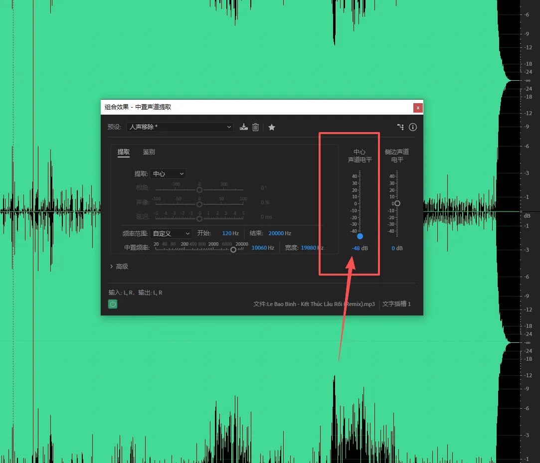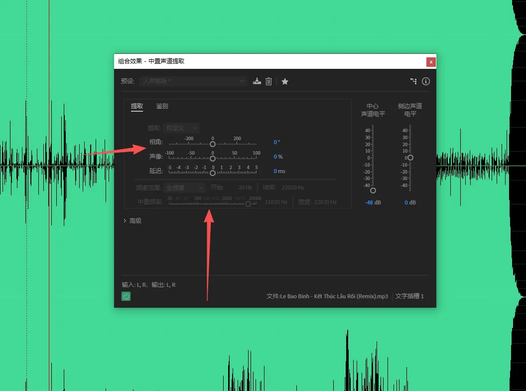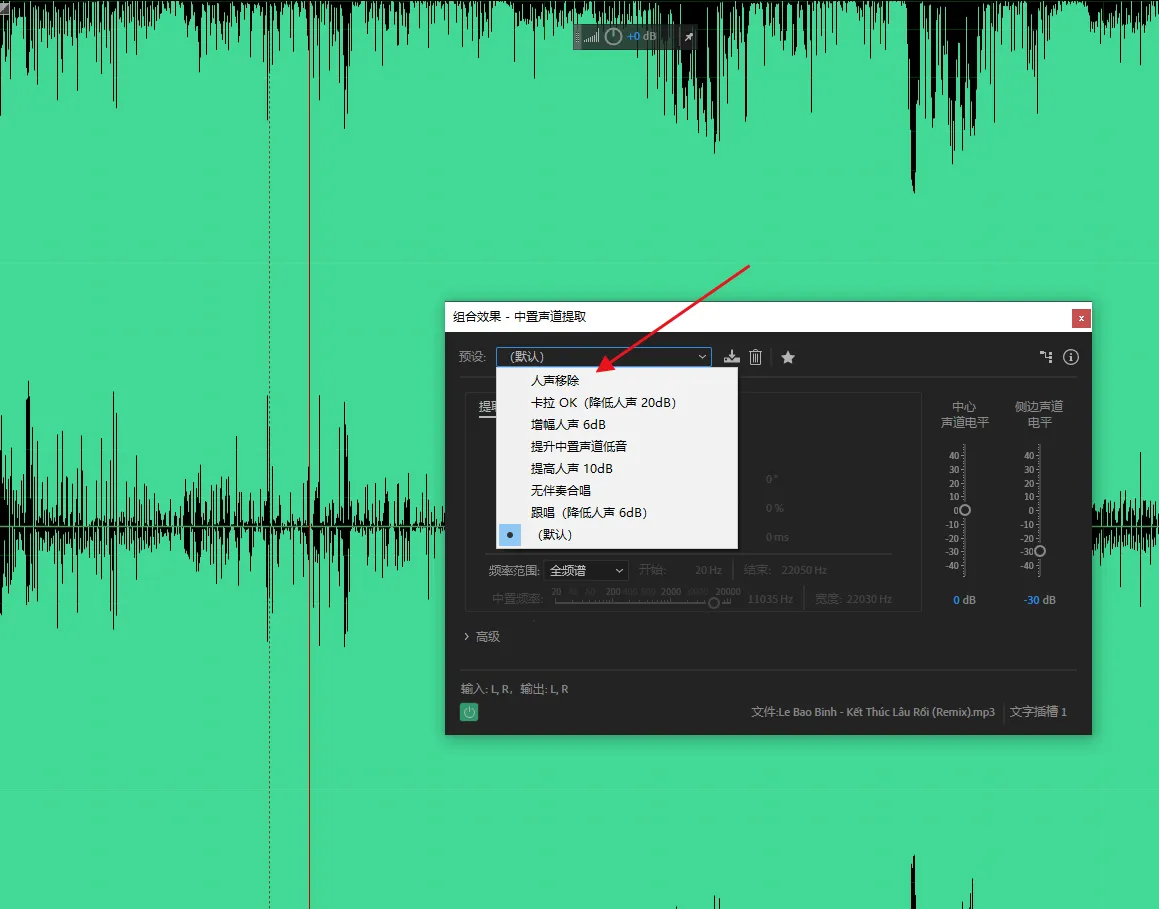 这是 AU 自带的专业人声提取与抑制插件,提伴奏效果最稳定。