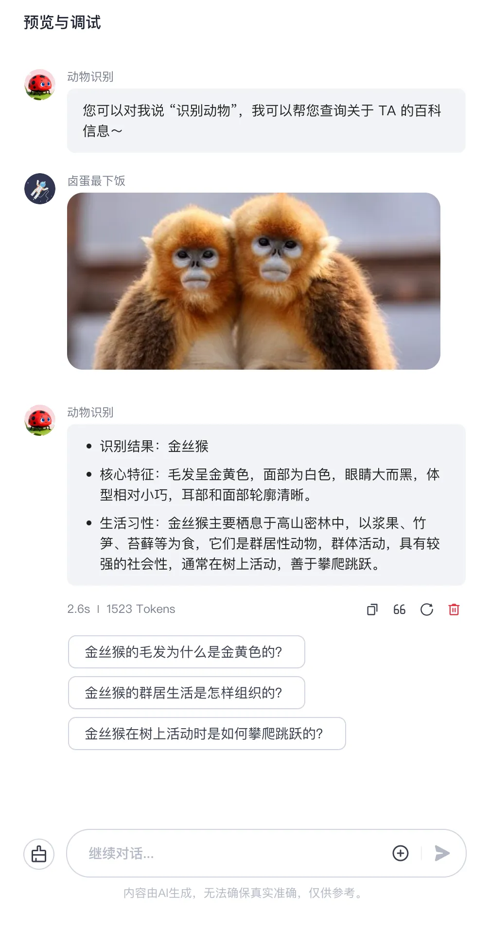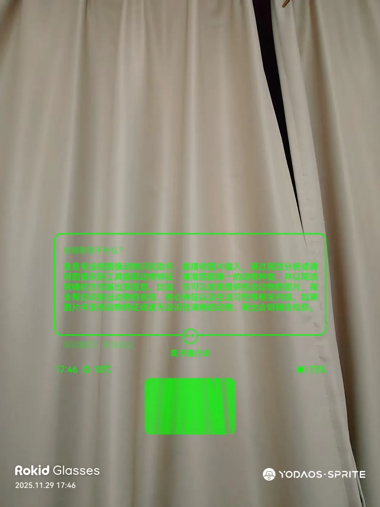 然后我们找一张动物图片测试一下智能体回复,完美按约束进行回复并输出到眼镜终端。
