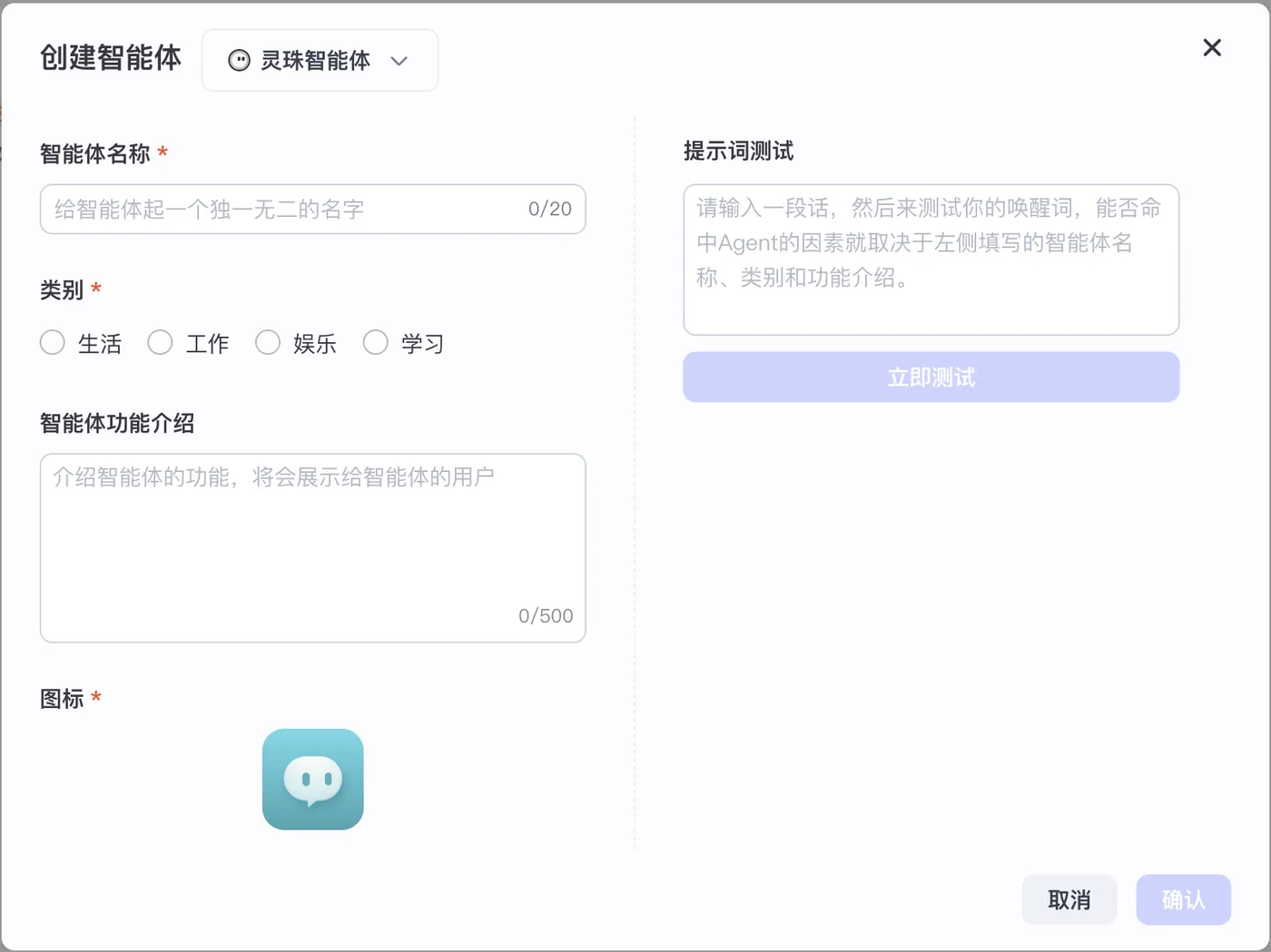 首先登录AI Glasses产品绑定的平台,点击左上角创建按钮即可,然后根据弹窗提示填写你要开发的智能体的相关信息。