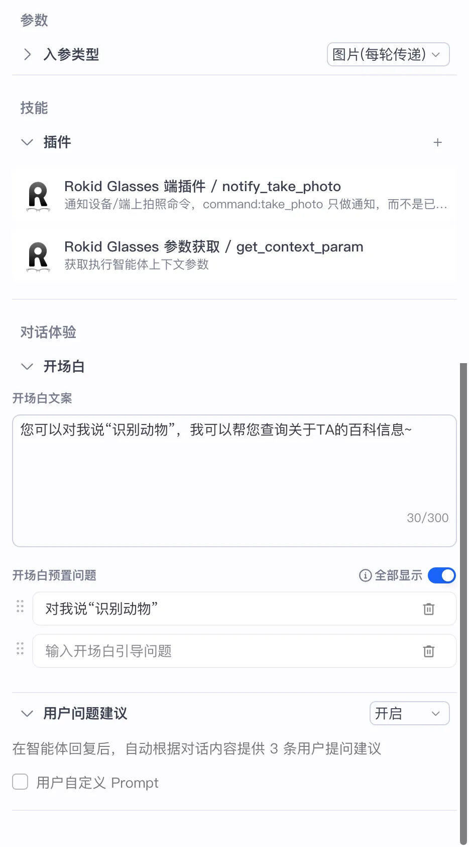 插件选择眼镜端的拍照、执行上下文插件即可,开场白可根据自己的需求进行设置
