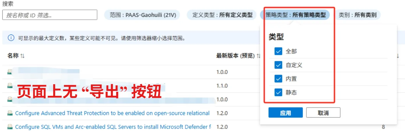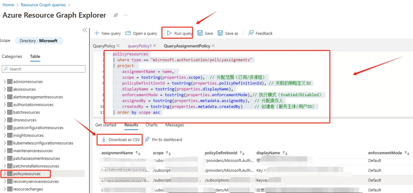 Azure Policy 本身不提供批量导出按钮,但可以通过 Azure Resource Graph Explorer 编写 KQL 查询,获取策略相关数据并导出为 CSV 文件。