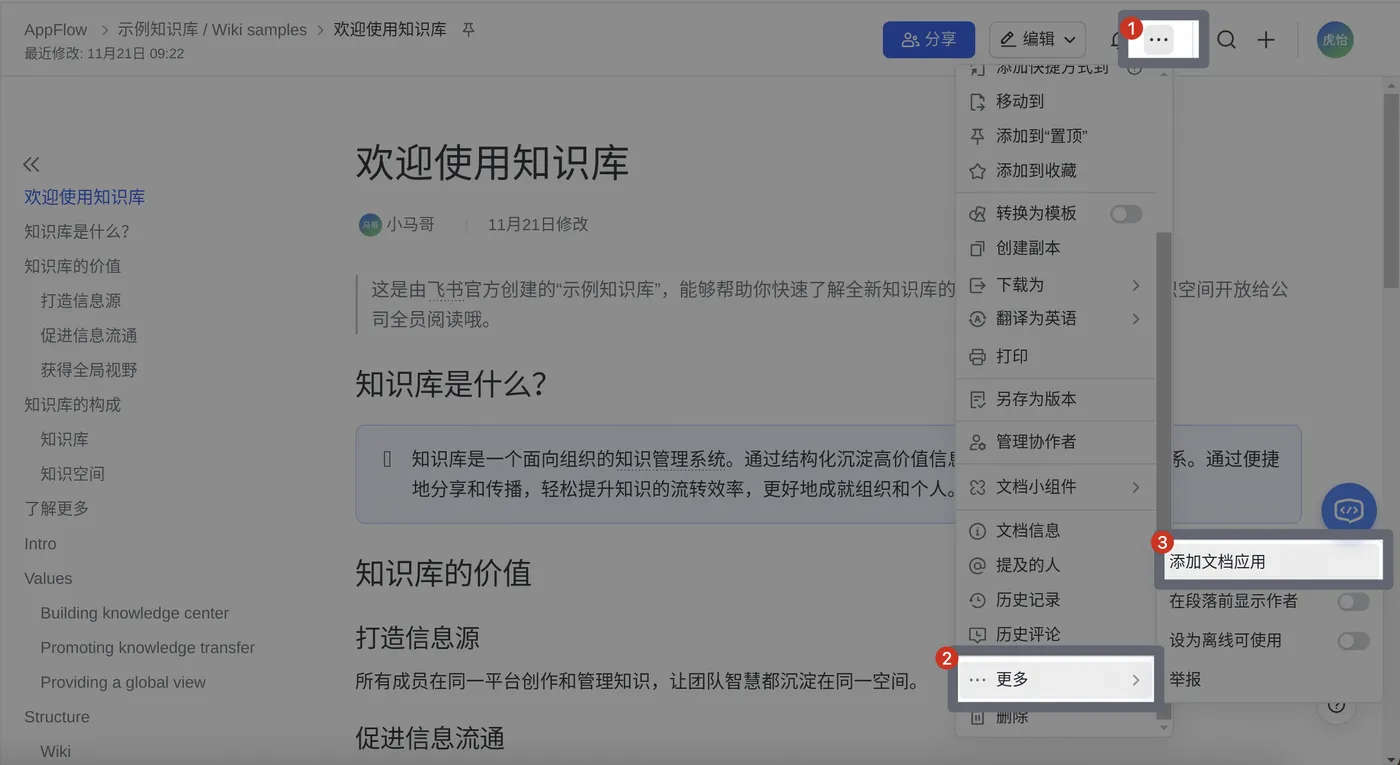 - 如果同步指定的某些文档,打开文档,点右上角“..."——更多——添加文档应用,搜索上面的应用添加。如果已经添加了管理员,可以不用再添加文档应用。