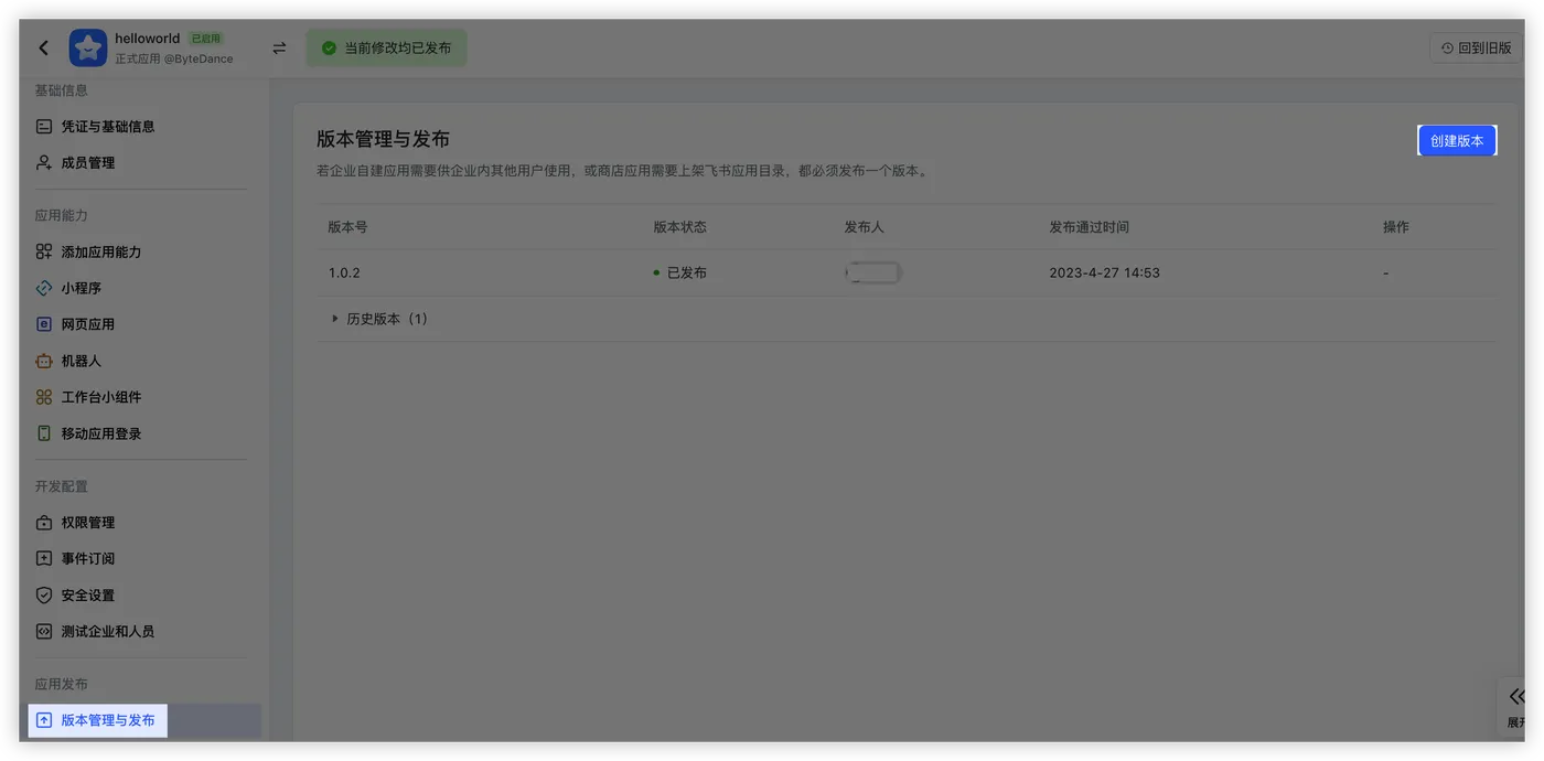 - 在左侧导航栏,选择 应用发布 > 版本管理与发布,并点击 创建版本。
