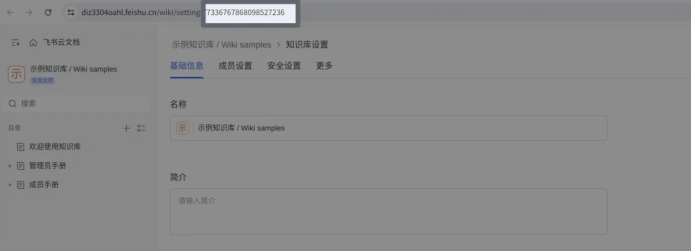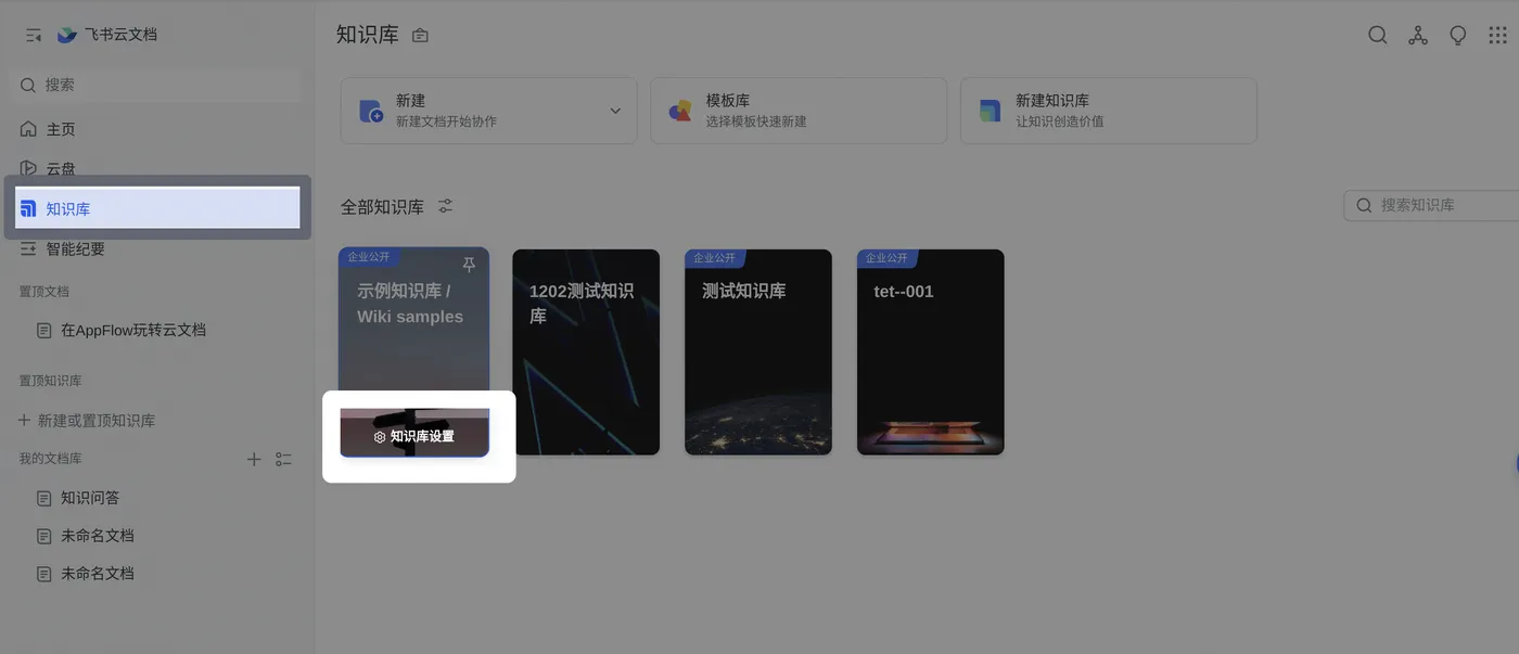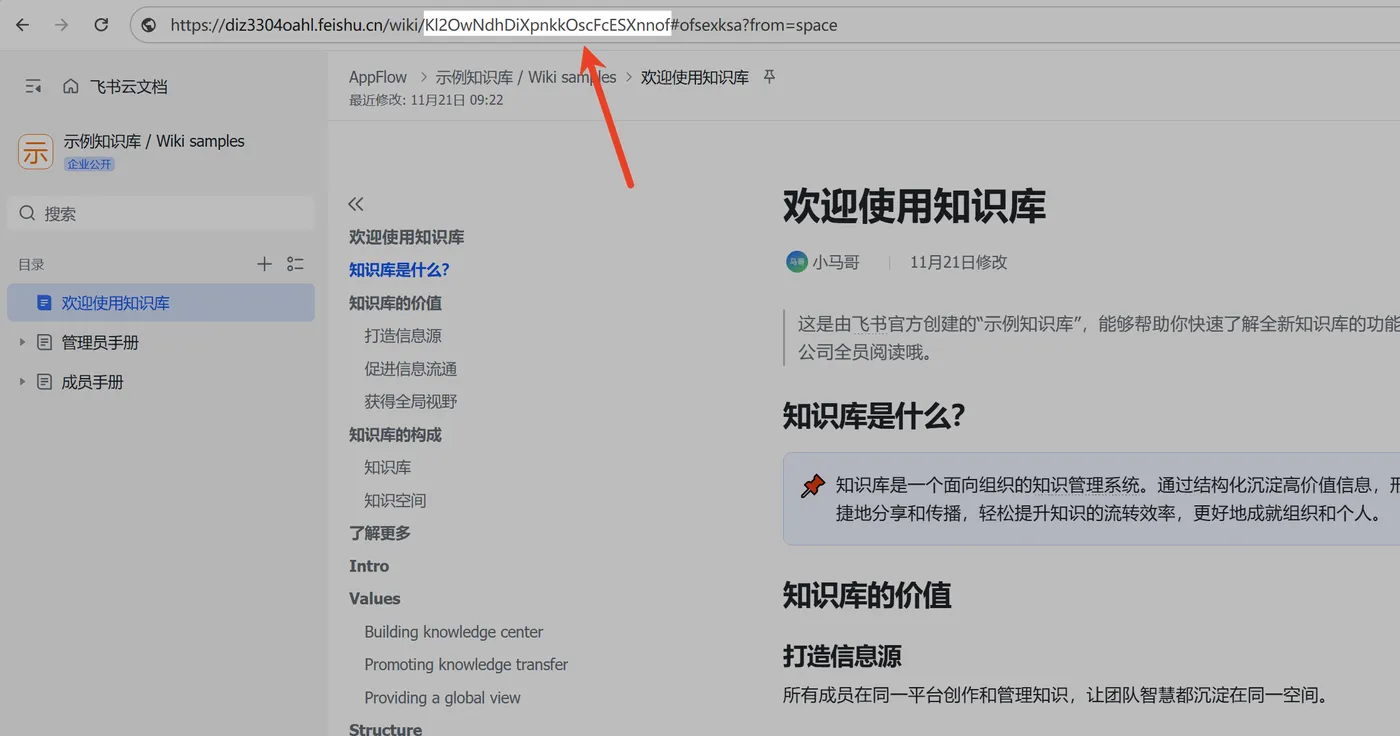 飞书知识库首页,选择目标知识库,点击‘知识库设置’,在页面URL中的最后长串数字部分即为知识库Token。AppFlow将获取您指定的整个知识库文档。