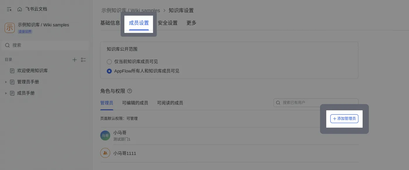 - (推荐设置)如果需要同步整个知识库,需要在知识库设置——成员设置——管理员——添加管理员,搜索并添加一个包含有这个机器人的群聊(一定要先把机器人添加到群,再到知识库添加群)