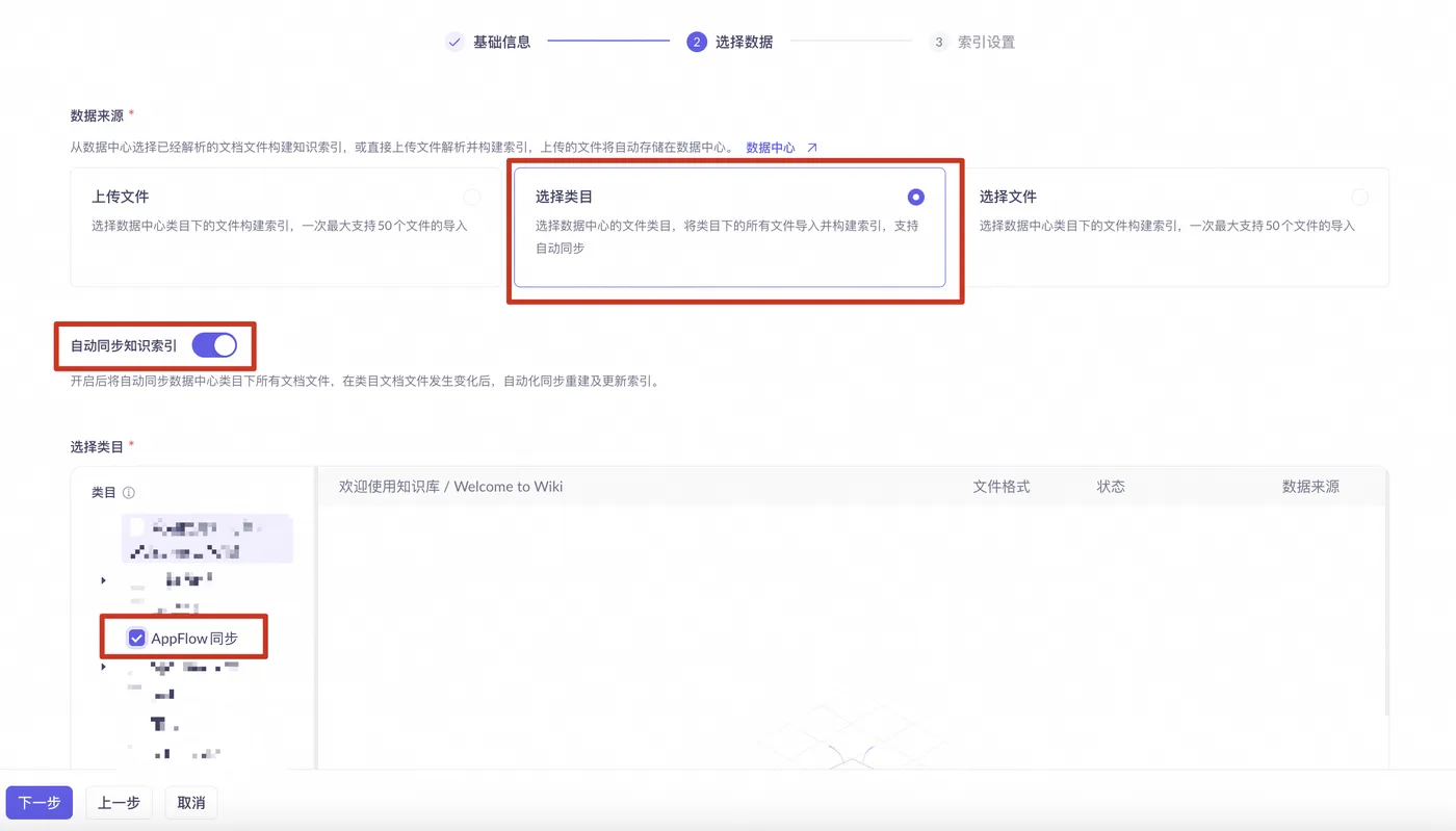 - 入参配置 —— 可以选择同步整个知识库、某个目录 或 指定的多个文档。