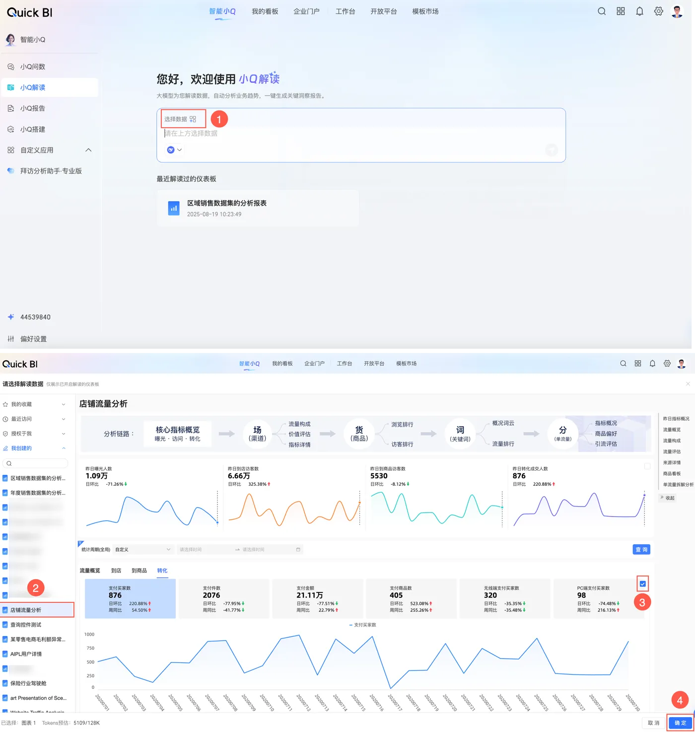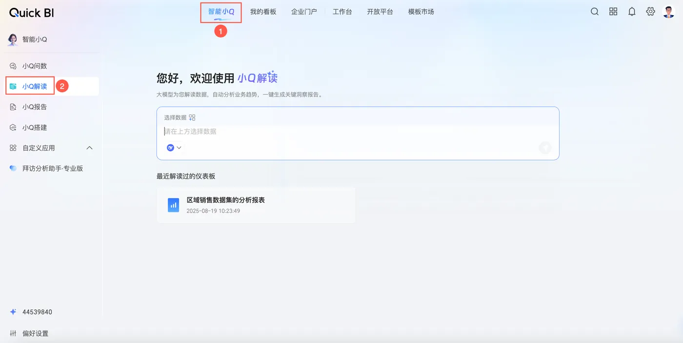 - 进入“智能小Q”模块,输入业务问题(如“本周销量最高的产品”);