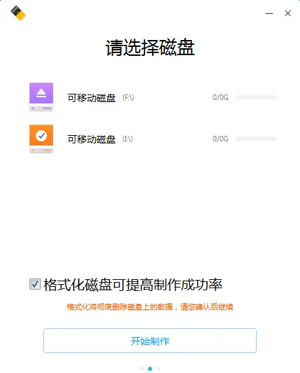 3、选择准备好的“可移动磁盘(U盘)”,勾选“格式化磁盘可提高制作成功率”,点击“开始制作”,如下图所示;