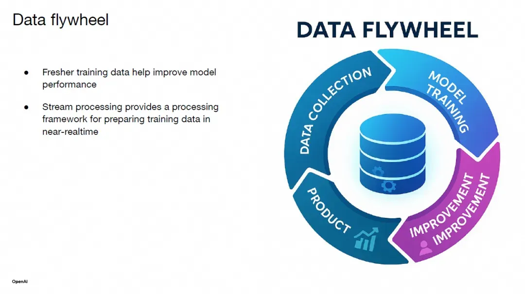从高层次看,数据飞轮是一个自强化系统,其中数据生成、模型改进和产品使用不断相互促进,以推动性能和价值的提升。我们发现,更快地将产品使用数据反馈给大模型,实际上能带来有意义的差异。流处理技术可以通过提供一个可扩展的框架,在 OpenAI 的规模上近乎实时地处理和转换数据,从而帮助实现数据飞轮的目标。