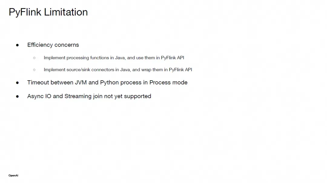 到目前为止,我们已经在 OpenAI 将 PyFlink 投入生产。然而,我们也观察到了一些挑战,首先是效率问题。基本上,正如我们所见,所有的 Python 函数(用户逻辑)都在 Python 中运行,并且在进程模式下 IPC 期间会产生额外的序列化和反序列化成本。因此,对于大规模作业,我们也支持用户用 Java 实现他们的处理函数。PyFlink 实际上支持从 Python DataStream API 调用它们,因此我们可以支持用 Python 编排流处理逻辑,但实际代码将在 JVM 中运行。