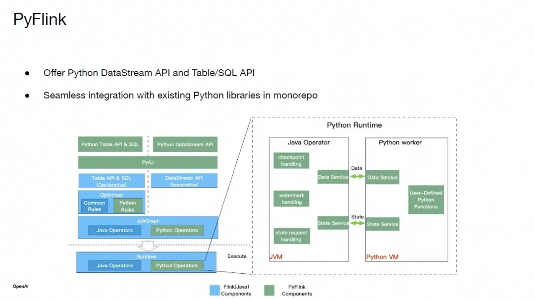 首先,我们来看看 Python。开源的 PyFlink 提供了 DataStream API 和 Table/SQL API。在 OpenAI 内部,我们将 PyFlink 与我们的单体仓库(monorepo)系统集成,使用户可以像开发常规 Python 项目一样,复用所有现有的 Python 库。
