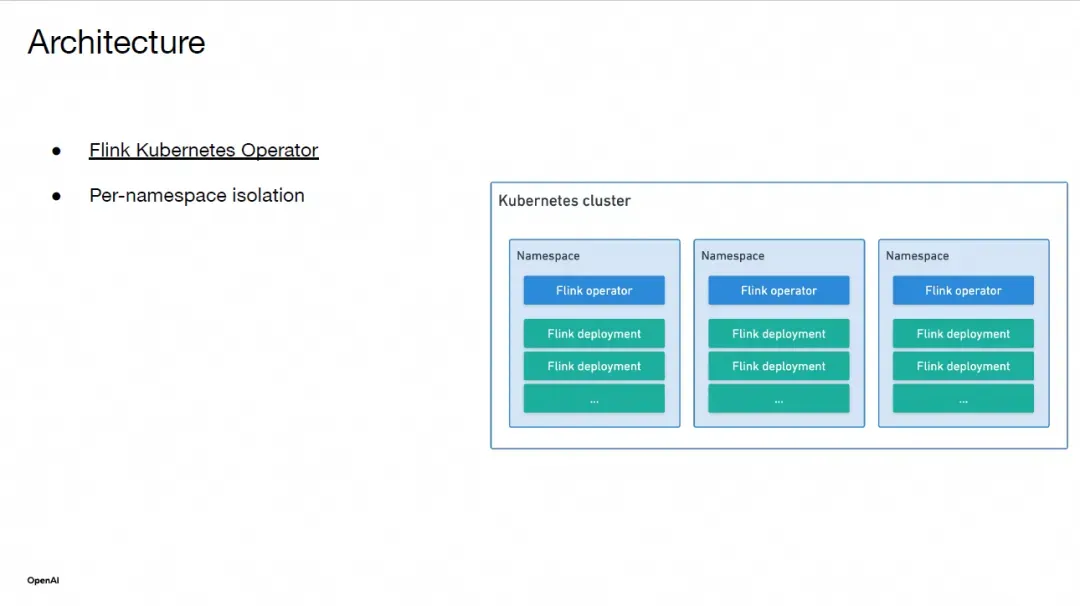 在每个 Kubernetes 集群内部,我们使用开源的 Flink Kubernetes Operator 来编排 Flink 作业。该 Operator 为 Kubernetes 集群内的管道提供生命周期管理。我们将每个 Flink 作业作为 Flink Deployment 自定义资源运行。Flink 部署通过 Kubernetes 命名空间在不同团队和组织之间进行隔离。我们为每个命名空间运行一个专用的 Flink Kubernetes Operator。