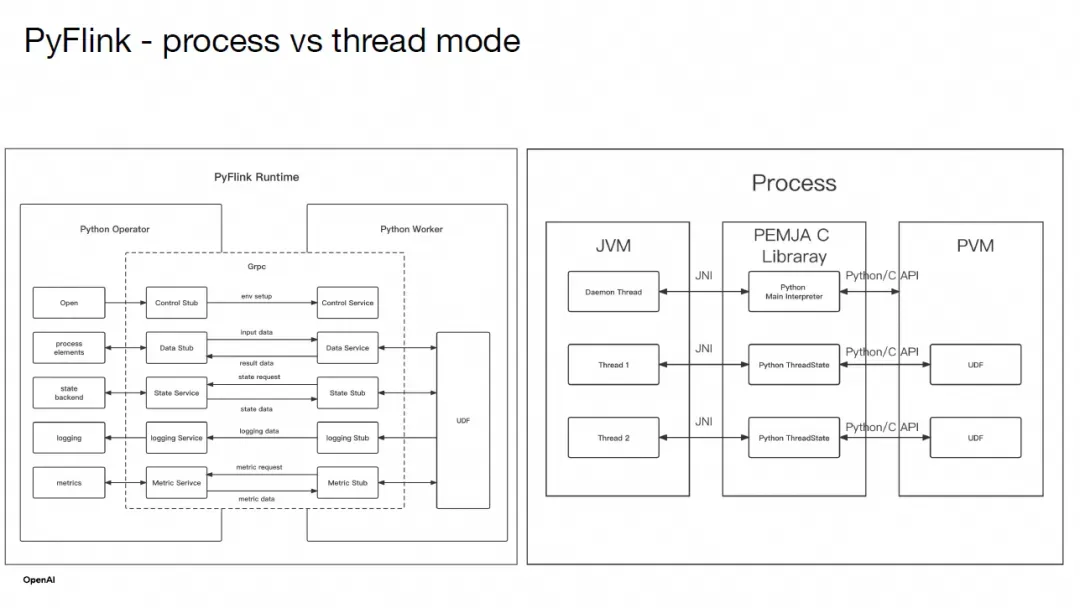 PyFlink 目前支持两种不同的执行模式来运行 Python 用户自定义函数:进程模式(process mode)和线程模式(thread mode)。默认模式是进程模式。在进程模式下,用户的 Python 函数作为单独的进程运行,并使用 Apache Beam 的可移植性框架与 JVM 算子通信。它具有良好的资源隔离性,总体上也更成熟。然而,其局限性在于 IPC 开销,因为它们使用 gRPC 在 JVM 进程和 Python 进程之间进行通信。这会带来序列化和反序列化的开销。此外,这也需要更多的调优参数来适应不同类型的工作负载,例如批处理大小(batch size)和批处理超时(batch timeout)。