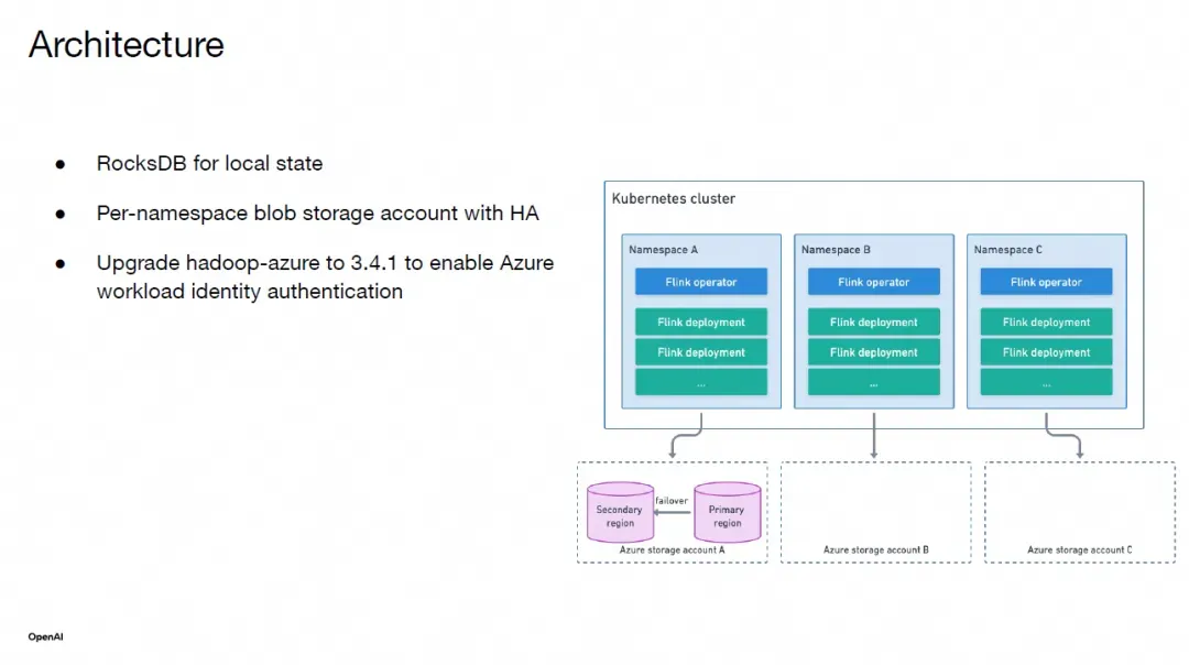 对于有状态的管道,我们使用本地 RocksDB 来存储状态,并为每个命名空间设置 Azure Blob Storage 账户,并为该账户启用异地复制(geo-replication)。在主区域发生故障时,我们可以初步故障转移到辅助区域。目前,平台为所有团队管理 Azure Blob Storage 账户,但我们也允许用户选择提供自己的 Blob 存储账户。