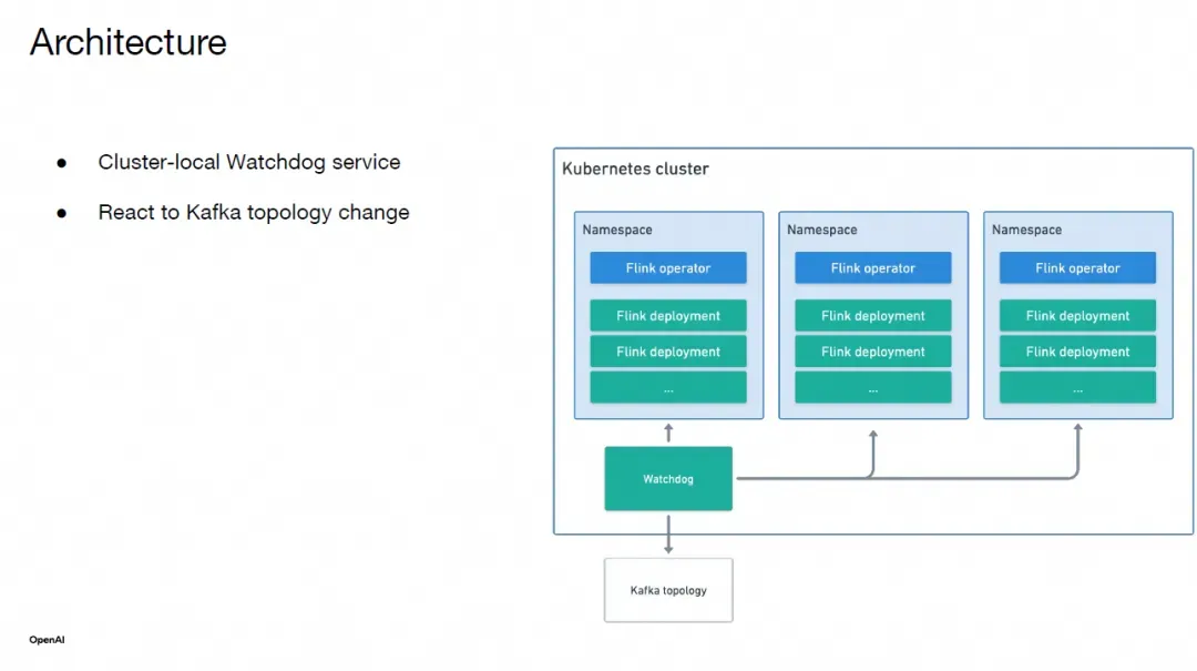 虽然 Flink Kubernetes Operator 处理了 Flink 的大部分管道生命周期管理,但为了满足 OpenAI 的特定需求,我们还设置了一个跨集群的看门狗(watchdog)服务,用于监控 Flink 作业所依赖的 OpenAI 特定配置变更。例如,看门狗服务会定期检查每个 Flink 作业的主题的 Kafka 拓扑。如果我们发现有新的物理集群被添加或移除,看门狗将触发 Flink 作业的重启,以便它能获取最新的 Kafka 拓扑变更,从而避免数据丢失或延迟。