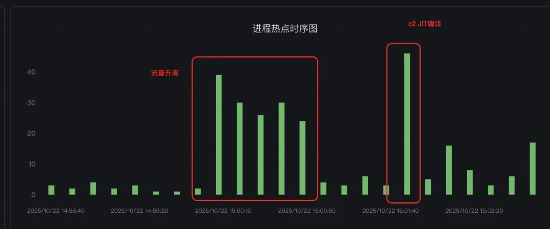 - 通过热点栈和热点分析对比,发现内存突增时间点的 cpu 栈也是 c2 compiler 的 JIT 栈,且 c2 compiler 热点前有部分业务流量突增,且业务代码使用了大量反射操作(反射操作会导致 c2 compiler 进行新的预热)。