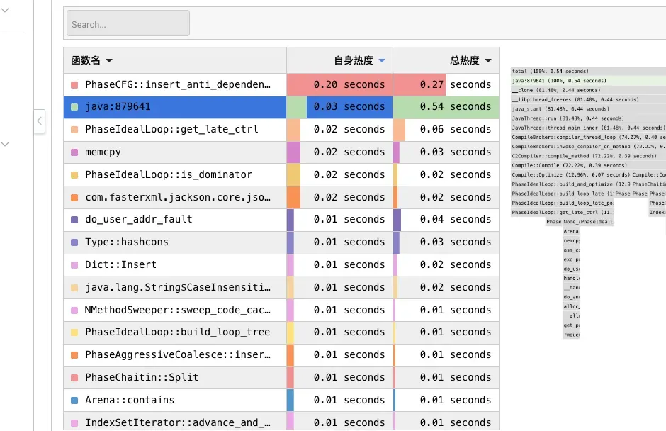 - 从内存分配火焰图中,我们可以看到主要的内存申请为 C2 compiler 正在进行代码 JIT 预热;