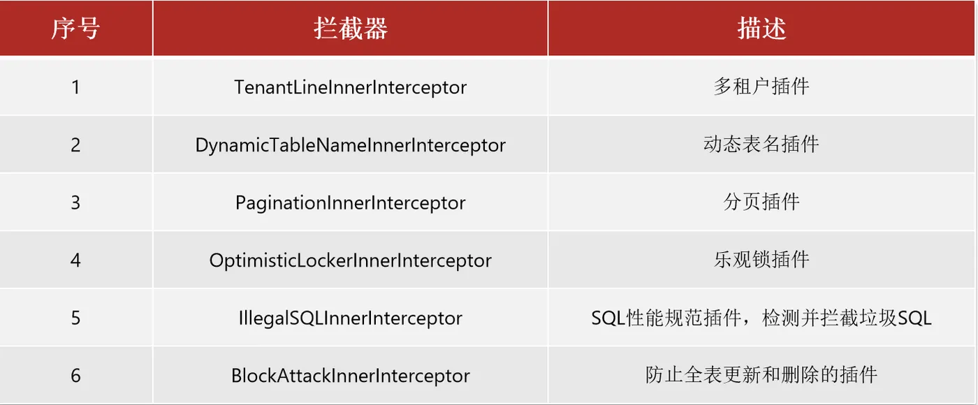 MP提供的内置拦截器如下,借助于这些拦截器我们就可以实现一些比较有意思的功能了。这里我们给大家讲解一下使用频率最高的分页插件。【项目二会使用到动态表名插件-做分库分表】