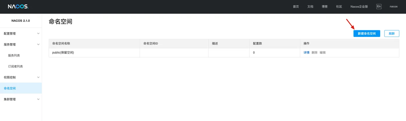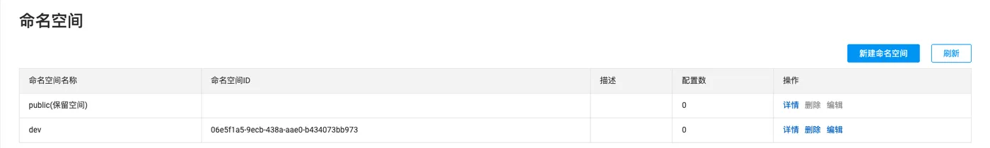日常开发过程中,我们一般会有dev、test、poc、prod等多个环境,同一个服务不同环境之间因存在代码不一致问题肯定需要做隔离调度,Nacos通过namespace解决此问题,配置页面如下,我们新增一个dev: