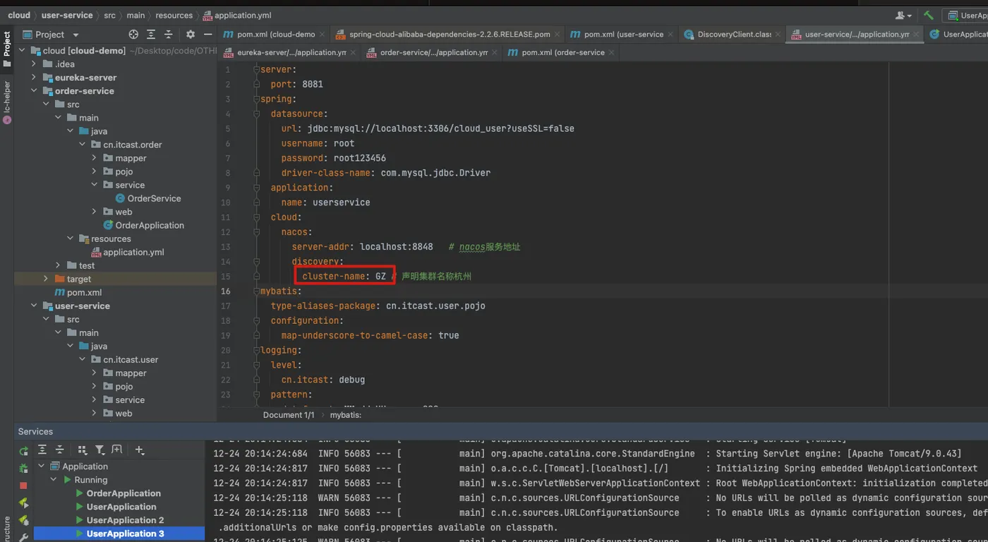 cloud: nacos: server-addr: localhost:8848 # nacos服务地址 discovery: cluster-name: HZ # 声明集群名称杭州