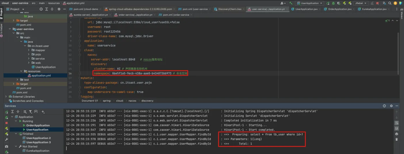 我们修改user-service的配置文件,增加namespace,并重启服务再次访问会发现服务恢复正常