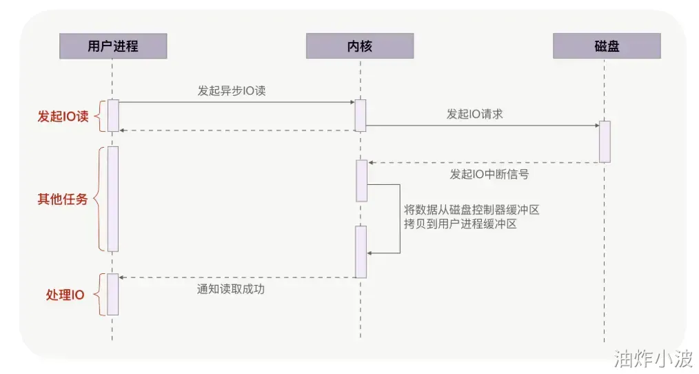 异步 IO(异步 IO 既可以处理网络 IO,也可以处理磁盘 IO,这里我们只关注磁盘 IO)可以解决阻塞问题。它把读操作分为两部分,前半部分向内核发起读请求,但不等待数据就位就立刻返回,此时进程可以并发地处理其他任务。当内核将磁盘中的数据拷贝到进程缓冲区后,进程将接收到内核的通知,再去处理数据,这是异步 IO 的后半部分。如下图所示: