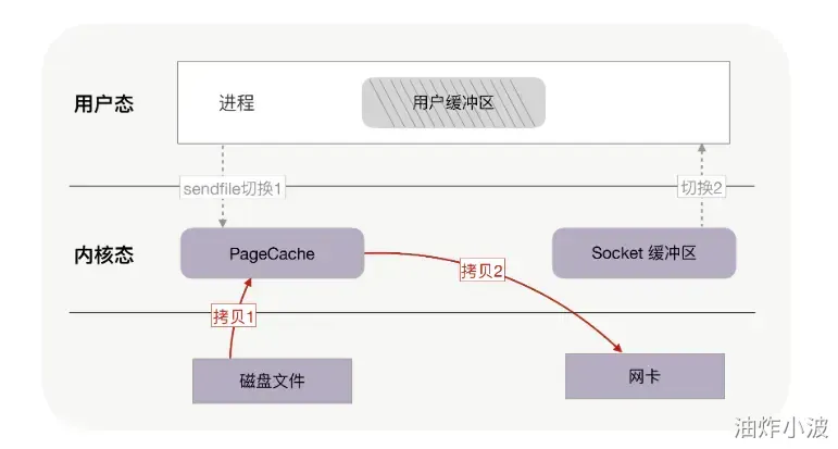 再提一句,为什么读取磁盘文件时,一定要做上下文切换呢?这是因为,读取磁盘或者操作网卡都由操作系统内核完成内核负责管理系统上的所有进程,它的权限最高,工作环境与用户进程完全不同。只要我们的代码执行 read 或者 write 这样的系统调用,一定会发生 2 次上下文切换:首先从用户态切换到内核态,当内核执行完任务后,再切换回用户态交由进程代码执行。因此,如果想减少上下文切换次数,就一定要减少系统调用的次数。解决方案就是把 read、write 两次系统调用合并成一次,在内核中完成磁盘与网卡的数据交换。