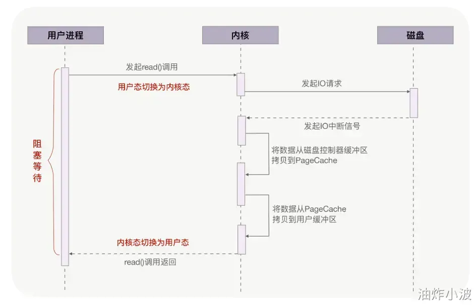 回到开头的例子,当调用 read 方法读取文件时,实际上 read 方法会在磁盘寻址过程中阻塞等待,导致进程无法并发地处理其他任务,如下图所示:也就是在拉数据的过程中,一整个流程下来进程都是阻塞的意思。