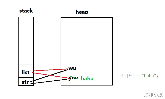 第二种情况:str[0] = "gujin"; 那么 list.get(0)也会随之修改。[涉及栈堆指针操作,修改数组的数据,导致同样引用该数据的list值被改变]