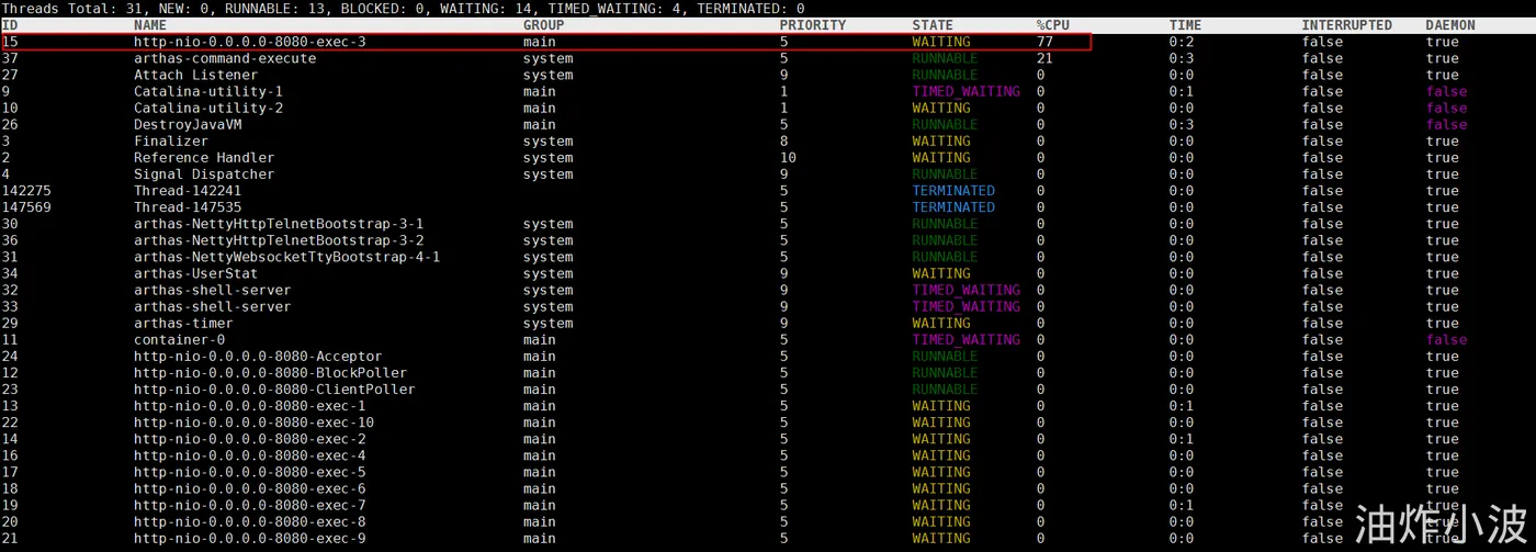 下图可以很直观的看出,我们的应用瞬间占用了77%的CPU(这里我是发起请求瞬间,通过thread查看的,所以比较直观,生产环境应该只有阻塞,死锁这种状态才会比较直观)